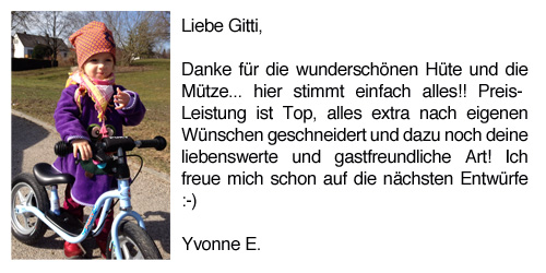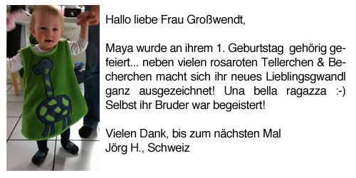 Seit 2011 fertige ich in meinem kleinen Atelier auch einzigartige Kinderkleidung. Als frischgebackene Oma werde ich ständig von meinem Enkelzwerg zu neuen Outfits inspiriert.